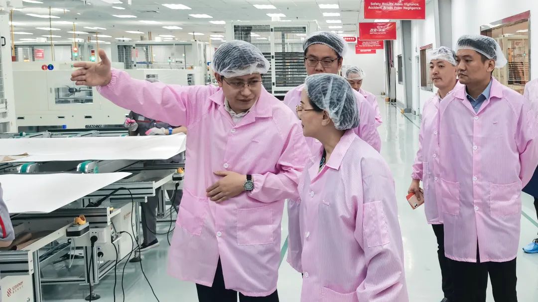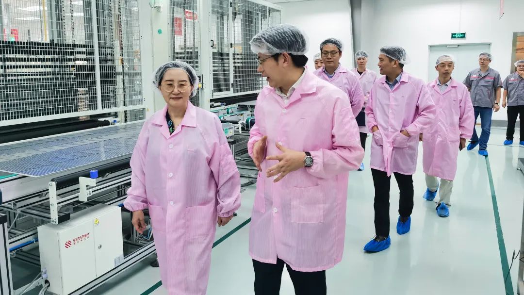 安徽省政协原副秘书长,省科技成果转化促进会、顾问委员会副主任汪沪敏一行还实地参观了金寨赛拉弗工厂光伏组件智能生产车间。参观过程中,她充分肯定了赛拉弗高效光伏组件的研发创新优势和赛拉弗制造分布式布局的发展潜力,对赛拉弗的市场前景充满信心。她指出,光伏产业是国家能源发展的重要组成部分,按照目前的发展前景,光伏在实现国家“30·60”任务中,发挥着巨大的作用,也有能力完成这个任务。