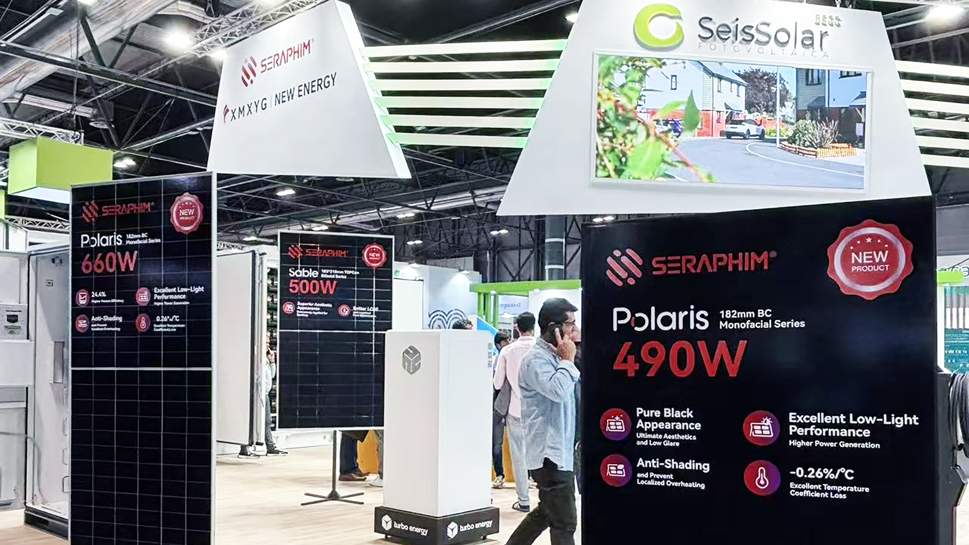 本次展会,赛拉弗多款新品惊艳登场,其中首次展出的北辰系列BC组件,以契合欧洲审美的全黑外观设计惊艳全场,吸引众多访客驻足停留,其采用的抗阴影遮挡技术可有效降低热斑风险,优异的温度系数更确保组件在南欧高温环境下依然保持稳健表现。同样大放光彩的还有赛博系列TOPCon组件,本次展出的54版型矩形片组件,兼具出色的LCOE表现与物流优势,适用于工商业屋顶与户用场景,为欧洲市场提供更灵活、更具价值的系统选择。